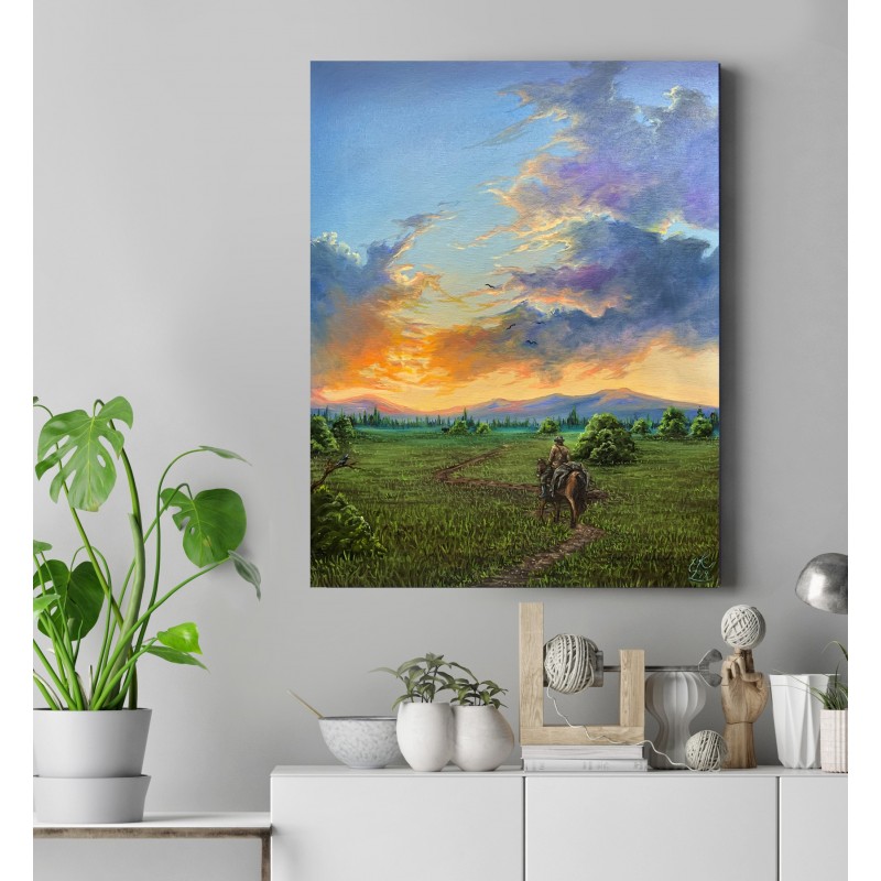 Tištěná kopie, je speciálně oskenovaný mnou malovaný obraz, který je následně vytištěn na bavlněné plátno. Plátno je napnuté na masivním dřevěném rámu.